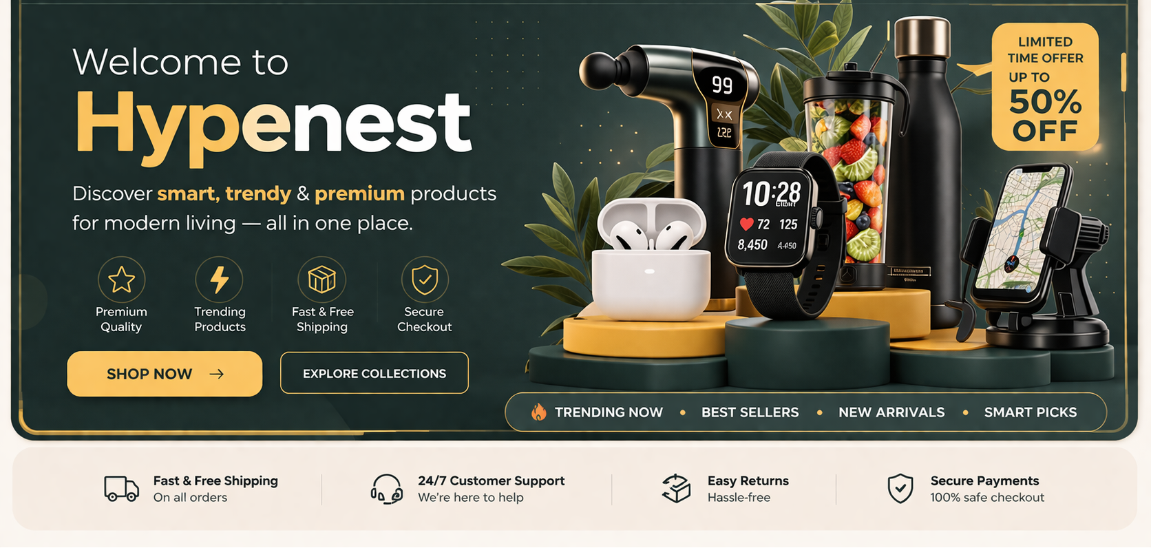 Welcome to Hypenest Discover smart, trendy, and premium products designed to upgrade your everyday lifestyle. ✨ Innovation meets convenience — all in one place.,